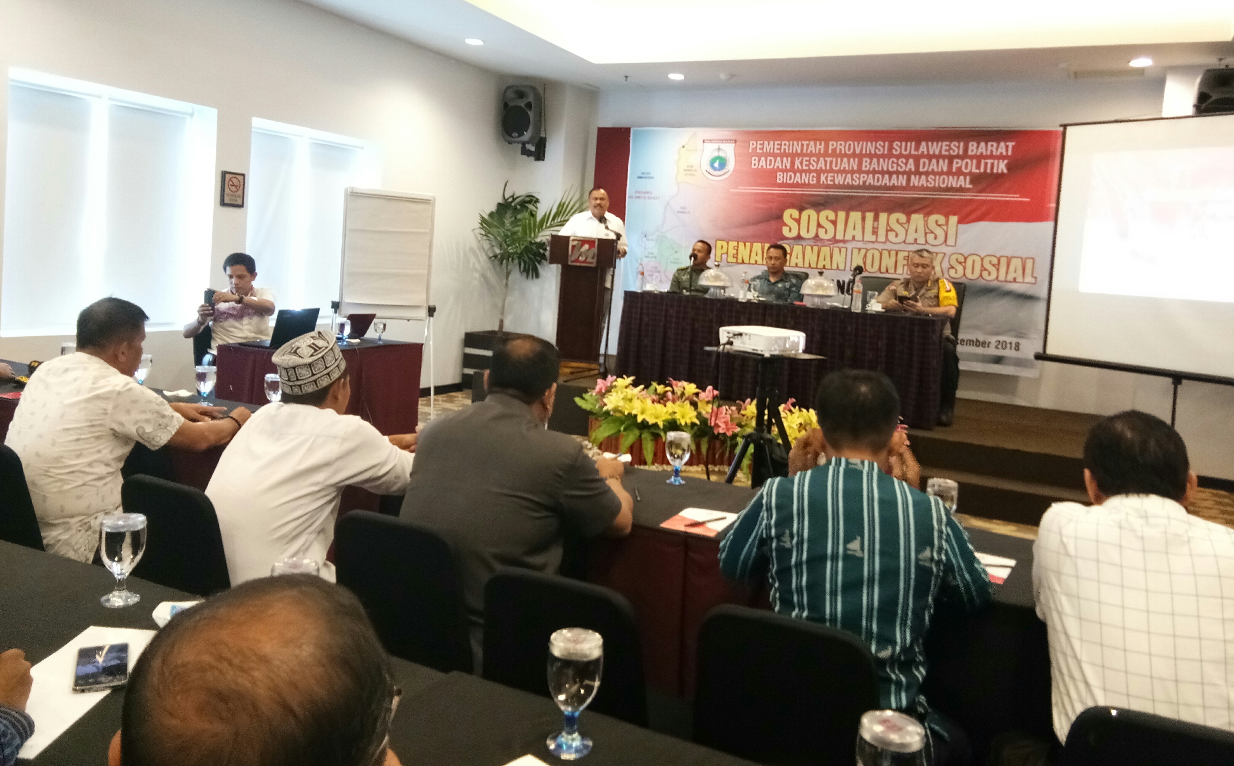 SULBARONLINE.COM, Mamuju – Badan Kesatuan Bangsa dan Politik (Kesbangpol) Sulbar, menggelar sosialisasi Penanganan Konflik Sosial, Jumat (7/12/18) di Hotel d’Maleo Mamuju.