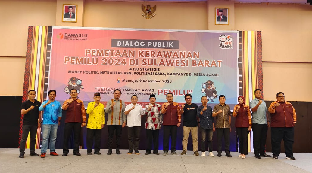 SULBARONLINE.COM, Mamuju – Badan Pengawas Pemilihan Umum (Bawaslu) Provinsi Sulawesi Barat menggelar dialog publik pemetaan kerawanan Pemilu 2024 di Hotel Maleo Mamuju, Sabtu (9/12/2023).