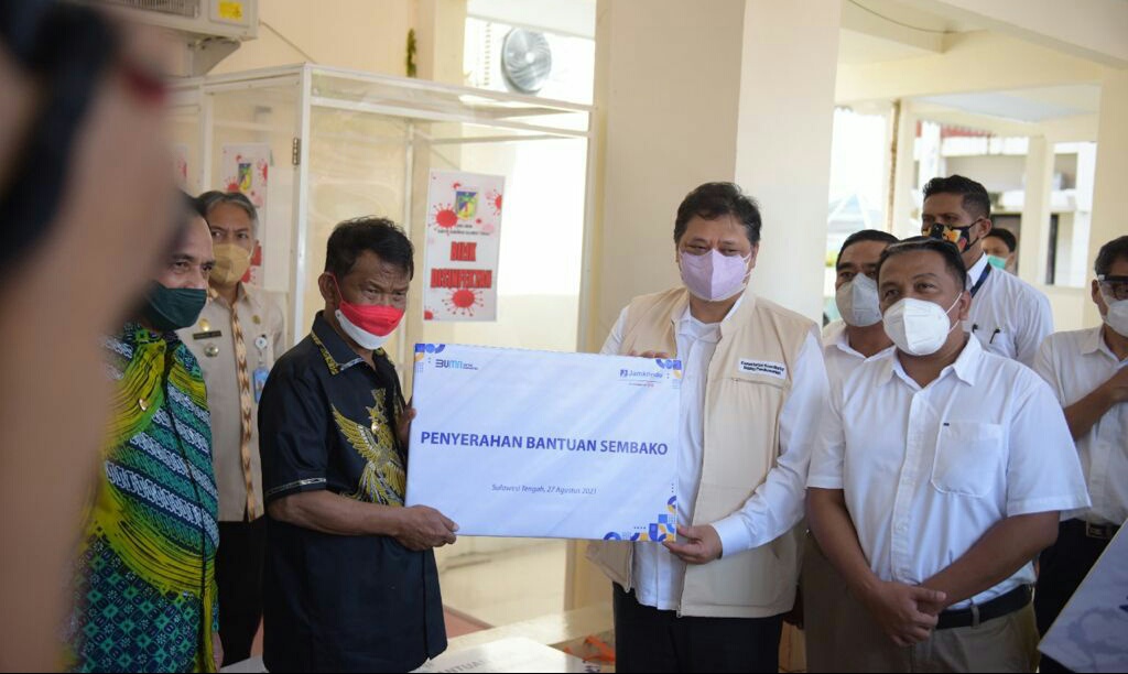 Dalam kunjungannya ke Kota Palu, Provinsi Sulawesi Tengah, Jumat (27/8), Menko Airlangga meninjau langsung Kampung Tangguh yang telah melakukan penanganan pandemi Covid-19 dengan sangat baik dan sekaligus memberikan bantuan berupa paket sembako, masker serta motor sampah untuk warga Kampung Tangguh yang secara simbolis diterima oleh Wakil Wali kota Palu Reny Lamadjido.