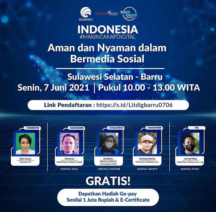 Dalam webinar yang digelar di Kota Barru, Sulawesi Selatan dengan dihadiri oleh 179 peserta ini, mengambil tema tentang “Aman, dan Nyaman dalam Bermedia Sosial”.