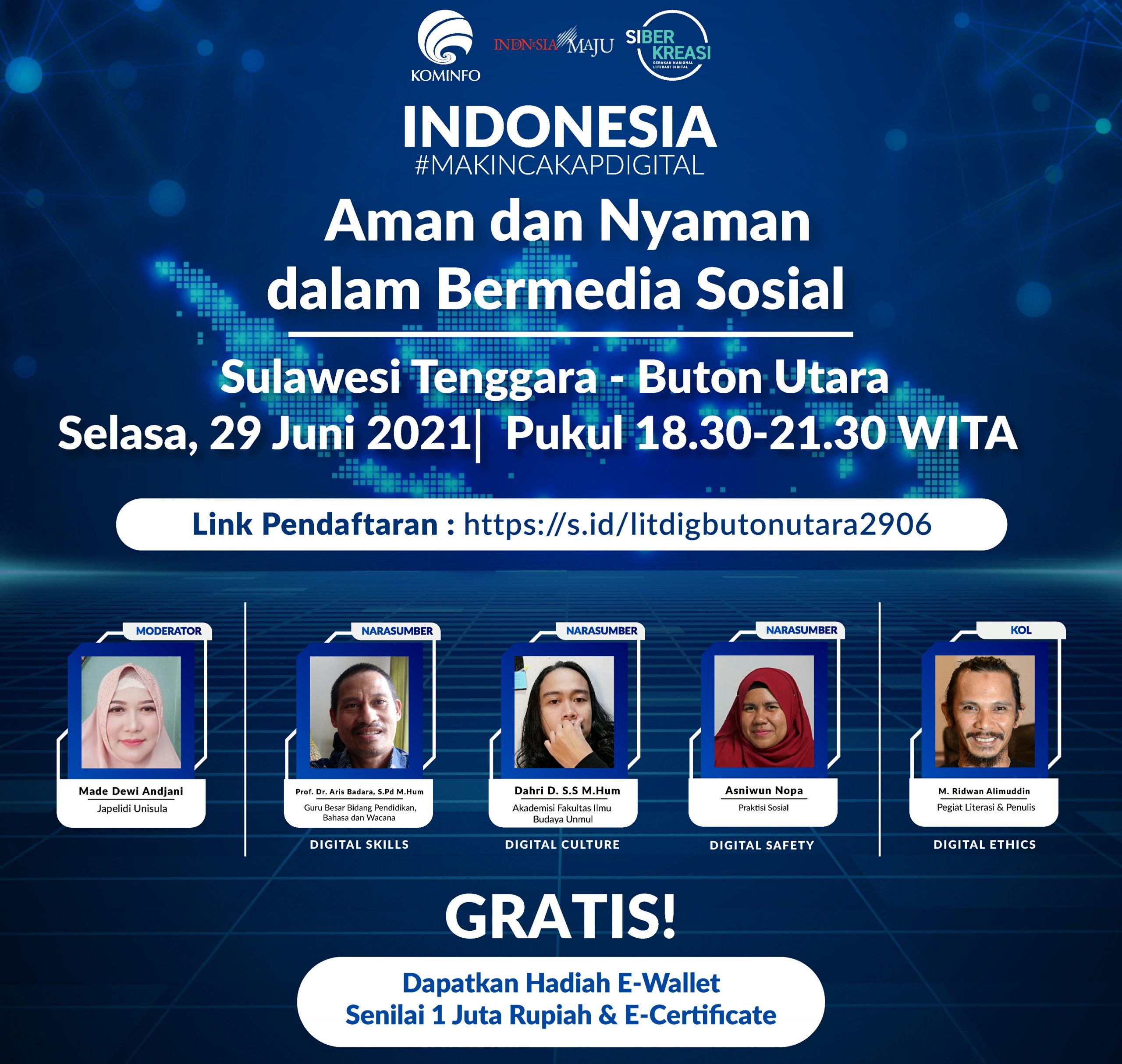 SULBARONLINE.COM, Buton Utara – Sebanyak 544 peserta mengikuti Rangkaian Program Literasi Digital “Indonesia Makin Cakap Digital” di Sulawesi, yang diselenggarakan oleh Kementerian Komunikasi dan Informatika Republik Indonesia dan Siberkreasi bersama Dyandra Promosindo. Kegiatan kali ini dilaksanakan secara virtual pada 29 Juni 2021 di Kabupaten Buton Utara, Sulawesi Tenggara.