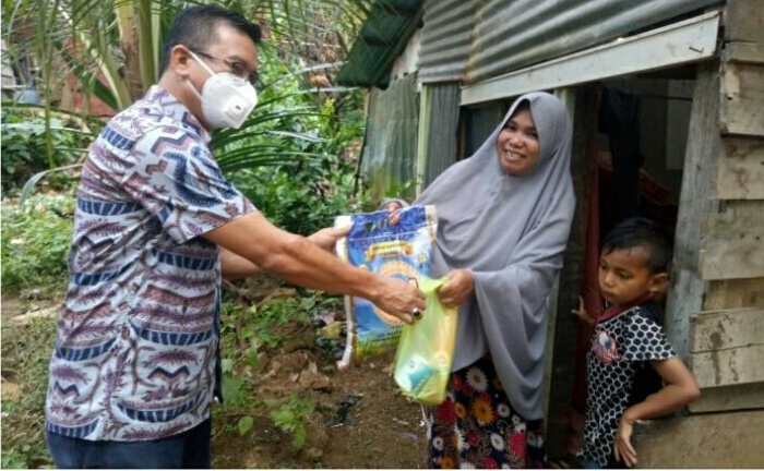 Dengan cara berjalan kaki dan door to door, Safaruddin menemui langsung warga di sejumlah titik dan menyerahkan paket sembako kepada warga.