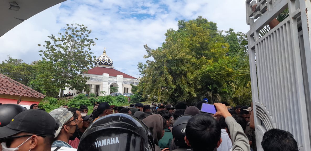 Demonstran ini terus berusaha menerobos masuk ke halaman kantor Bupati Mamuju, namun terus dihalangi oleh aparat pengamanan.