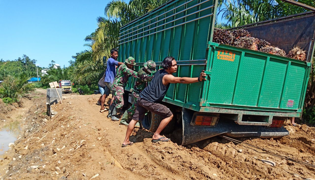 Seperti yang terlihat siang ini, truk pengangkut buah kelapa sawit terjadi selip akibat jalan berlumpur, sehingga terpaksa harus didorong oleh anggota Satgas TMMD bersama masyarakat di Desa Sanjango, Kecamatan Karossa, Kabupaten Mamuju Tengah (Mateng), Senin (7/10/19).