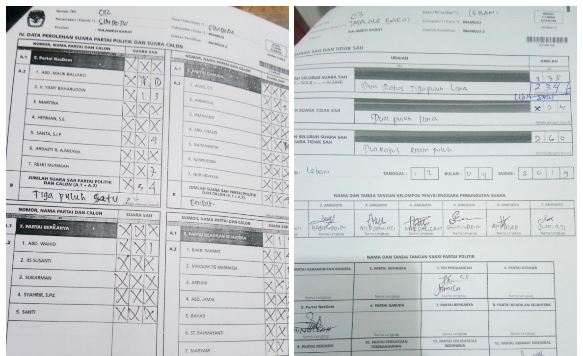 SULBARONLINE.COM, Mamuju – Liaison Officer (LO) Partai Hanura Kabupaten Mamuju, menemukan sejumlah kejanggalan dan kesalahan penginputan dan penulisan data pada C1 di sejumlah TPS di Kabupaten Mamuju.