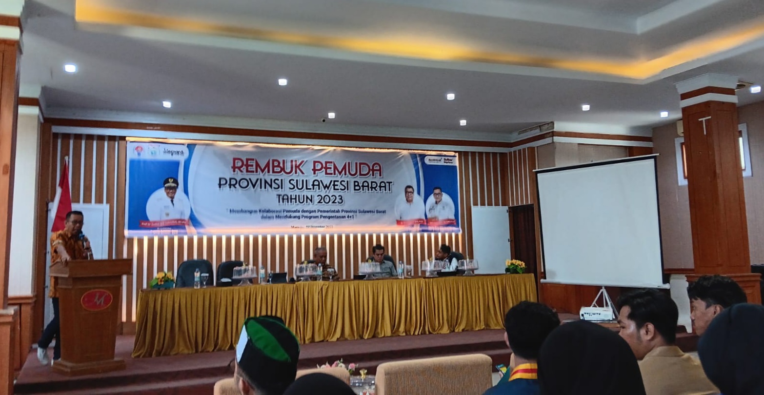 Kegiatan bertema “Membangun kolaborasi pemuda dengan pemerintah Provinsi Sulawesi Barat dalam mendukung program pengentasan 4 + 1” dibuka oleh Asisten I Bidang Pemerintah dan Kesra Pemprov Sulbar, Herdin Ismail.