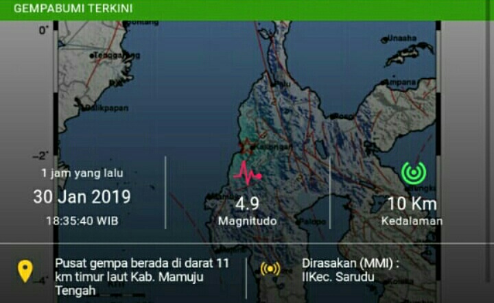 Gempa terakhir terjadi berada di Lokasi 1.93 LS-119.49 BT 12 Km Barat Daya Kecamatan Karossa, Kabupaten Mamuju Tengah, dengan kedalaman 10 km.