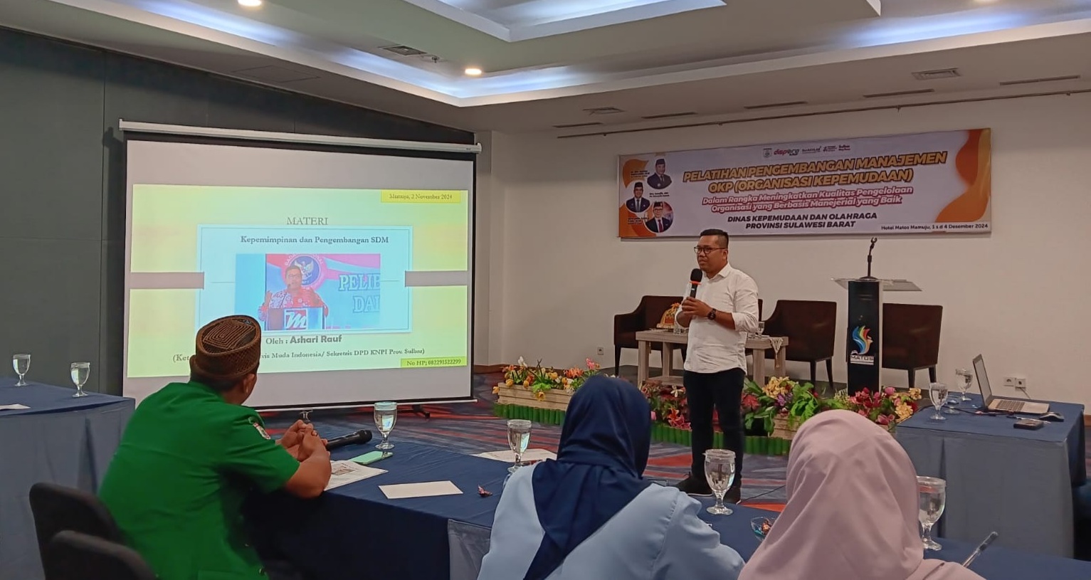 SULBARONLINE.COM, Mamuju — Ketua Pengurus Wilayah Komunitas Aktivisi Muda Indonesia (KAMI) Provinsi Sulawesi Barat, Ashari Rauf jadi narasumber di kegiatan Pelatihan Pengembangan Manajemen Organisasi Kepemudaan (OKP) yang digelar oleh Dinas Kepemudaan dan Olahraga (Dispora) Sulawesi Barat.