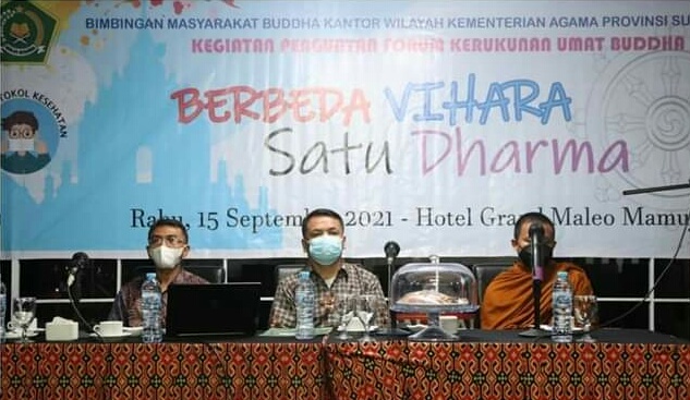 SULBARONLINE.COM, Mamuju — Kepala Bagian Tata Usaha (Kabag TU) Kanwil Kemenag Sulbar, H. Suharli yang mewakili Kepala Kanwil Kemenag Sulbar membuka kegiatan Penguatan Forum Kerukunan Umat Buddha yang diselenggarakan oleh Bimbingan Masyarakat Buddha Kanwil Kemenag Sulbar di ruang aula Grand d’Maleo Hotel, Rabu (15/9/21).