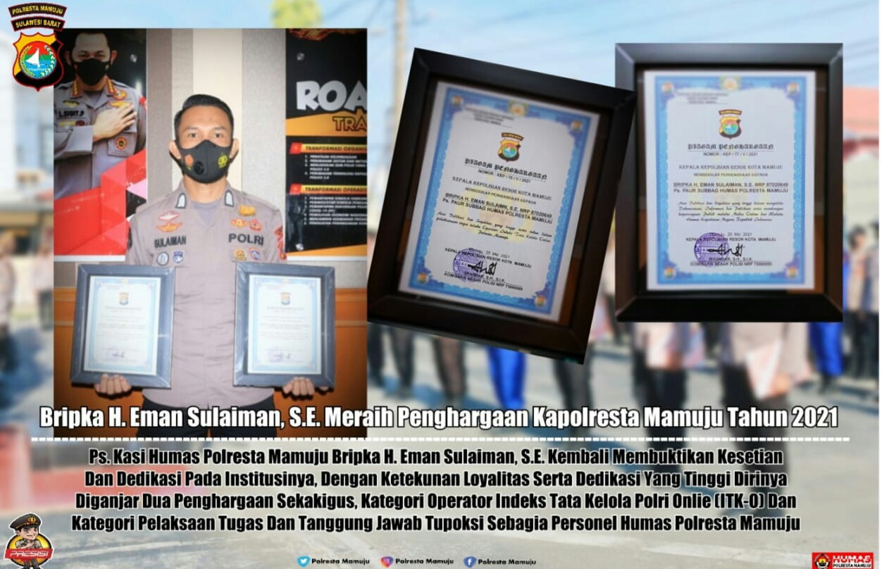 Kasi Humas Bripka H. Eman Sulaiman, S.E. kembali membuktikan kesetian dan dedikasi pada institusinya, dengan ketekunan loyalitas serta dedikasi yang tinggi dirinya diganjar dua penghargaan sekaligus, yaitu kategori operator Indeks Tata Kelola Polri Onlie (ITK-O) dan kategori pelaksaan tugas dan tanggung jawab tugas pokok sebagai personel Bagian Humas Polresta Mamuju.