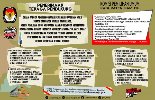 Ketua KPU Mamuju Hamdan Dangkang mengatakan, Sebanyak 16 tenaga pendukung untuk berbagai desk job bakal direkrut KPU Mamuju, dimana Seleksi penerimaan tenaga pendukung KPU Mamuju resmi dibuka sejak 27 Desember 2019, dan akan berkahir di 2 Januari 2020 nanti.