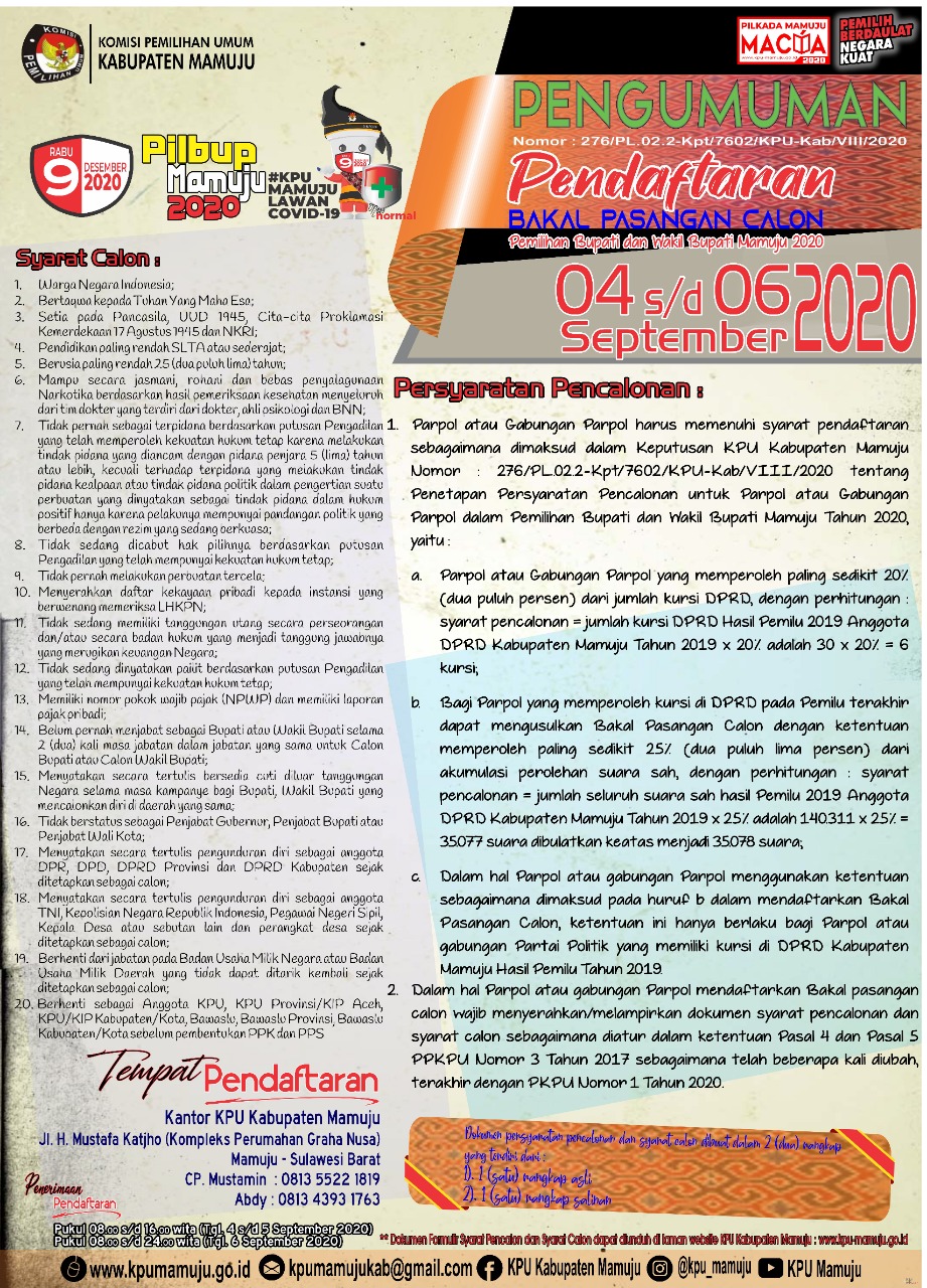 Detail pengumuman pendaftaran bakal pasangan calon dapat diunduh di menu pengumuman website kpu-mamuju.go.id. Untuk syarat pencalonan, serta formulir persyaratan bakal pasangan calon, dapat diunduh di menu regulasi website kpu-mamuju.go.id (*)
