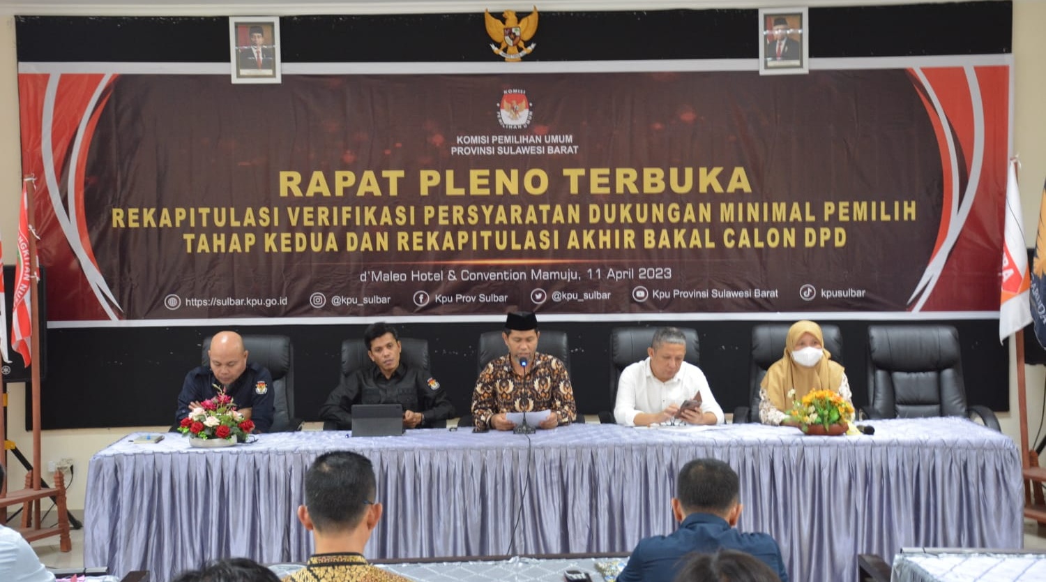 SULBARONLINE.COM, Mamuju — Komisi Pemilihan Umum (KPU) Provinsi Sulawesi Barat menggelar rapat pleno terbuka Rekapitulasi Verifikasi Persyaratan Dukungan Minimal Pemilihan Tahap Kedua dan Rekapitulasi Akhir Bakal Calon DPD RI. Pleno digelar di Aula Kantor KPU Sulbar, Selasa (11/04/2023).