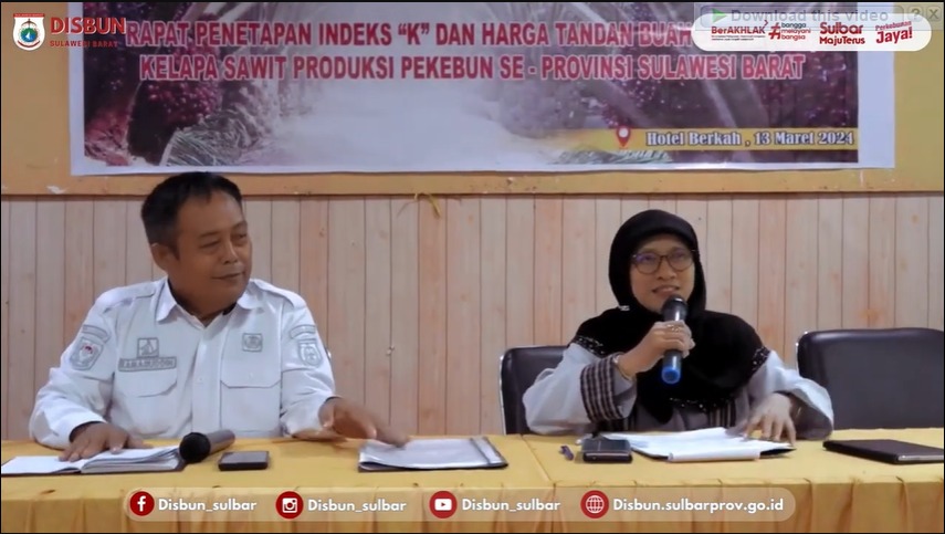 SULBARONLINE.COM, Mamuju — Dinas Perkebunan Provinsi Sulawesi Barat (Sulbar) melaksanakan Rapat Penetapan Indeks “K” dan Harga Tandan Buah Segar (TBS) Kelapa Sawit Produksi Pekebun Se-Sulbar Periode Maret 2024 di Hotel Berkah Jln. Soekarno Mamuju, Rabu (13/03/2024).