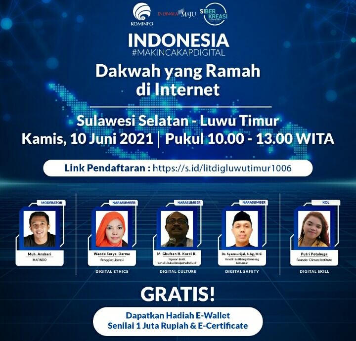 Sejumlah narasumber yang dihadirkan dalam webinar ini diantaranya pendiri Climate Institute, Putri Damayanti Potabuga; pegiat literasi dari KITA Bhinneka Tunggal Ika, Waode Surya Darma; penulis dari Yayasan Bakti, M Ghufran H Kordi; peneliti dari Balai Litbang Agama Kementerian Agama Makassar, Syamsurijal. Rangkaian Program Literasi Digital “Indonesia Makin Cakap Digital” di Sulawesi menargetkan peserta sebanyak 57.550 orang.