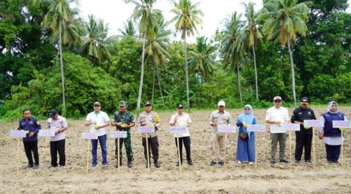 Bupati Majene Andi Achmad Syukri, bersama para pimpinan Oorganisasi Perangkat Daerah (OPD) yaitu Kadistanakbun, Kadis LHK, Kadis Ketapang, Camat Sendana, Pemerintah Desa Limbua serta perwakilan dari Kapolres Majene dan Dandim 1401, menanam bibit jagung tersebut secara bersamaan.