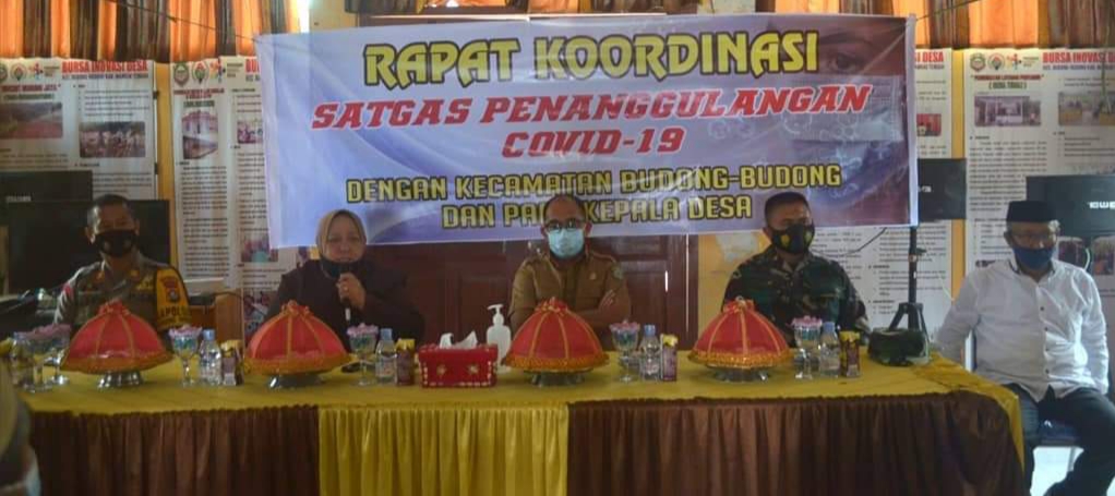 Rapat koordinasi satgas penanggulangan Covid-19 tersebut, dilaksanakan di Kantor Camat Budong-budong. Senin (8/2/21).