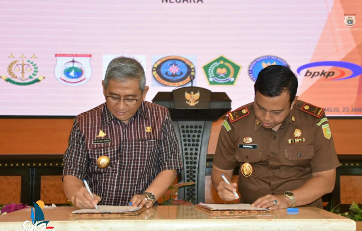 Kerjasama tersebut diperkuat dalam Memorandum Of Understanding (MoU) yang ditandatangani oleh Gubernur Sulbar Ali Baal Masdar, Kajati Sulbar Darmawel Aswar, Ketua DPRD Sulbar St. Suraidah Suhardi, Danlanal Mamuju La Ode Jimmy H.R, Kakanwil Kemenag Sulbar, Mufli B. Fatta, Kepala BNN Sulbar Brigjen Pol. Kenedy dan Kepala BPKP Sulbar Hasoloan Manalu, di ruang Auditorium lantai 4 Kantor Gubernur Sulbar, Kamis (23/01/2020).