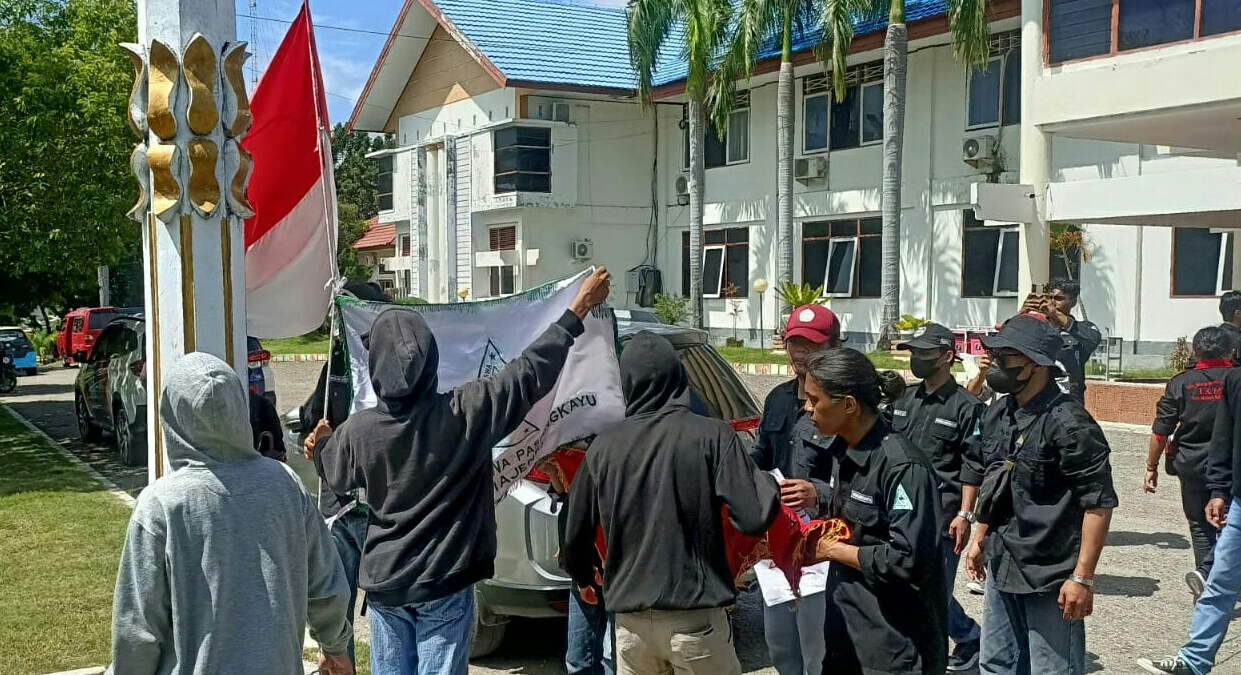 Selanjutnya, massa menurunkan dan memasang bendera organda di tali yakni bendera Organda Mamuju Tengah, bendera Organda Pasangkayu dan bendera Organda Enrekang. Kemudian, bendera merah putih dinaikkan kembali bersama bendera Aliansi Organda Majene.