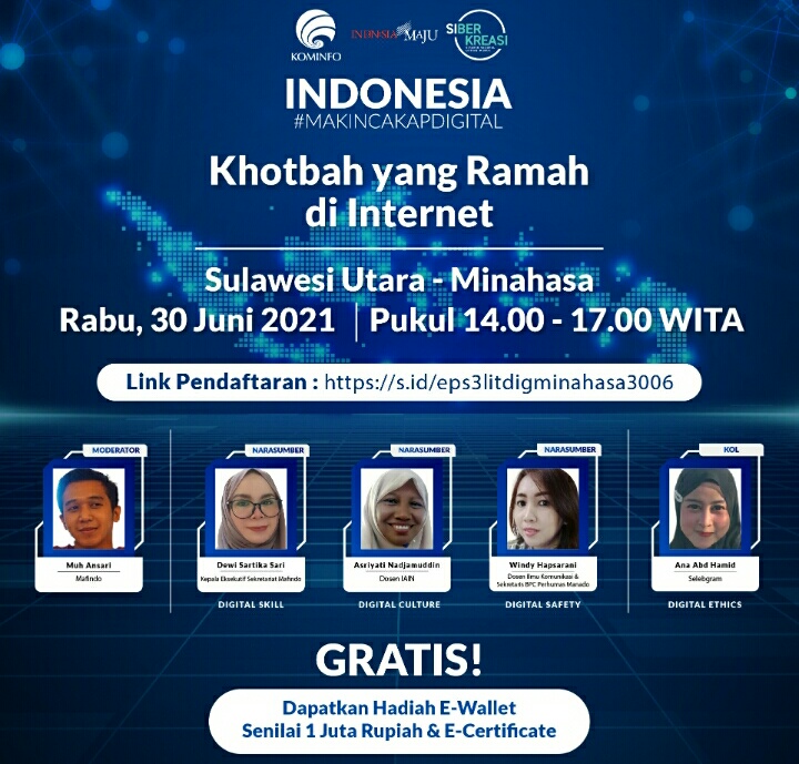 SULBARONLINE.COM, Minahasa – Rangkaian Program Literasi Digital “Indonesia Makin Cakap Digital” di Sulawesi, yang diselenggarakan oleh Kementerian Komunikasi dan Informatika Republik Indonesia dan Siberkreasi bersama Dyandra Promosindo, dilaksanakan secara virtual pada 30 Juni 2021 di Kabupaten Minahasa, Provinsi Sulawesi Utara.