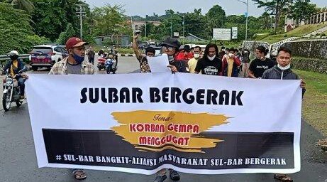 Massa aksi memulai aksinya dari depan kantor Gubernur Sulbar Jl Abd Malik Pattana Endeng, Simboro, Mamuju, sambil membentangkan spanduk bertema “Korban Gempa Menggugat”.