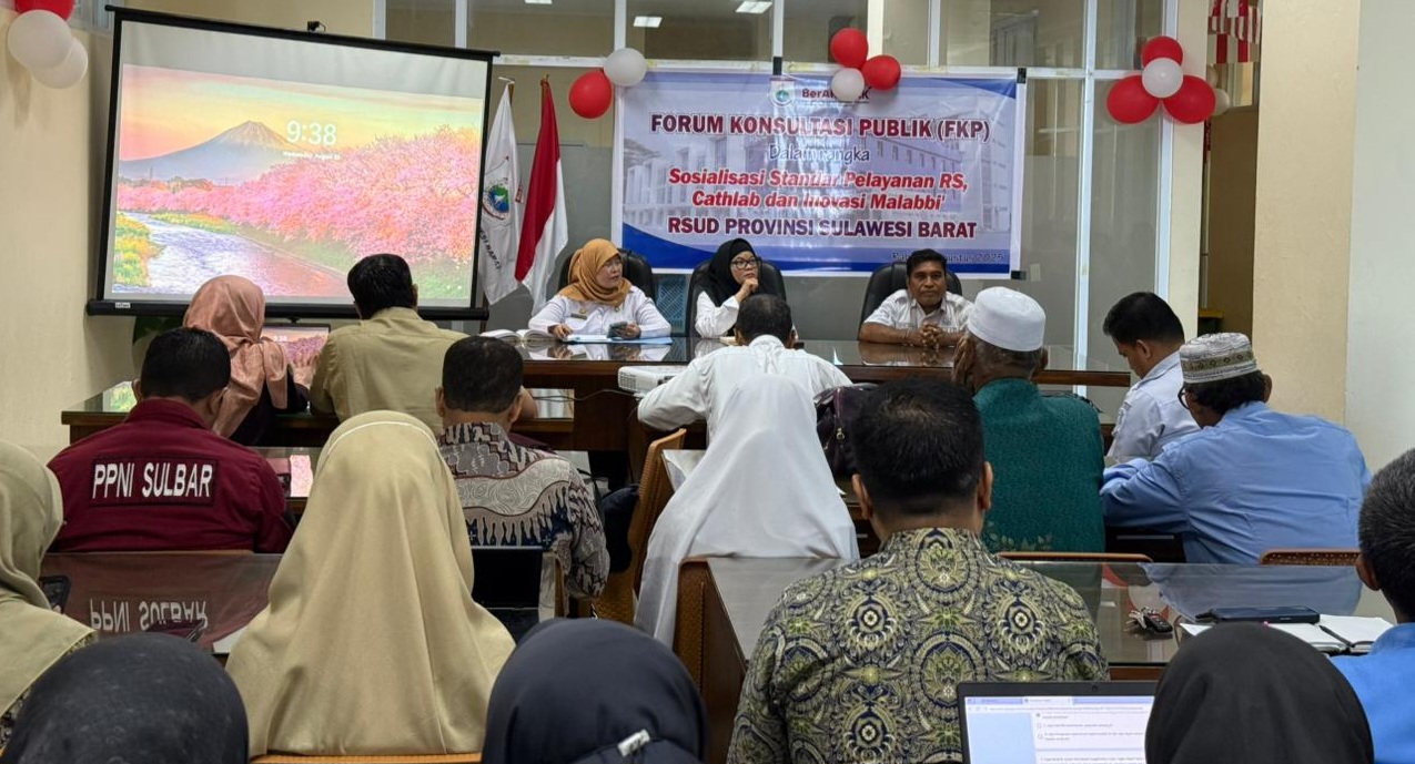 SULBARONLINE.COM, Mamuju – Rumah Sakit Umum Daerah (RSUD) Provinsi Sulawesi Barat menggelar Forum Konsultasi Publik (FKP) sebagai bagian dari sosialisasi Standar Pelayanan Rumah Sakit, Cathlab, serta inovasi layanan unggulan Malaqbbi’, Rabu (20/8).