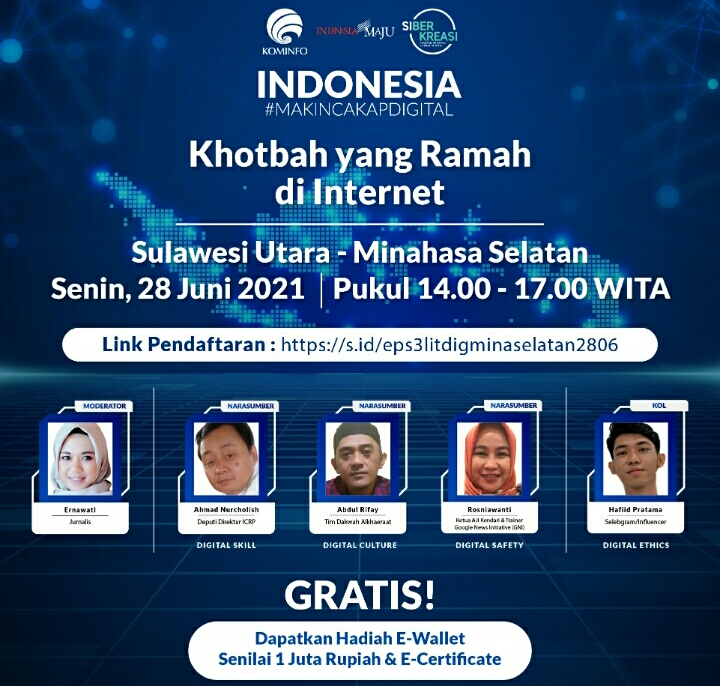 SULBARONLINE.COM, Minahasa Selatan — Rangkaian Program Literasi Digital “Indonesia Makin Cakap Digital” di Sulawesi, yang diselenggarakan oleh Kementerian Komunikasi dan Informatika Republik Indonesia dan Siberkreasi bersama Dyandra Promosindo, dilaksanakan secara virtual pada 28 Juni 2021 di Minahasa Selatan, Sulawesi Utara.