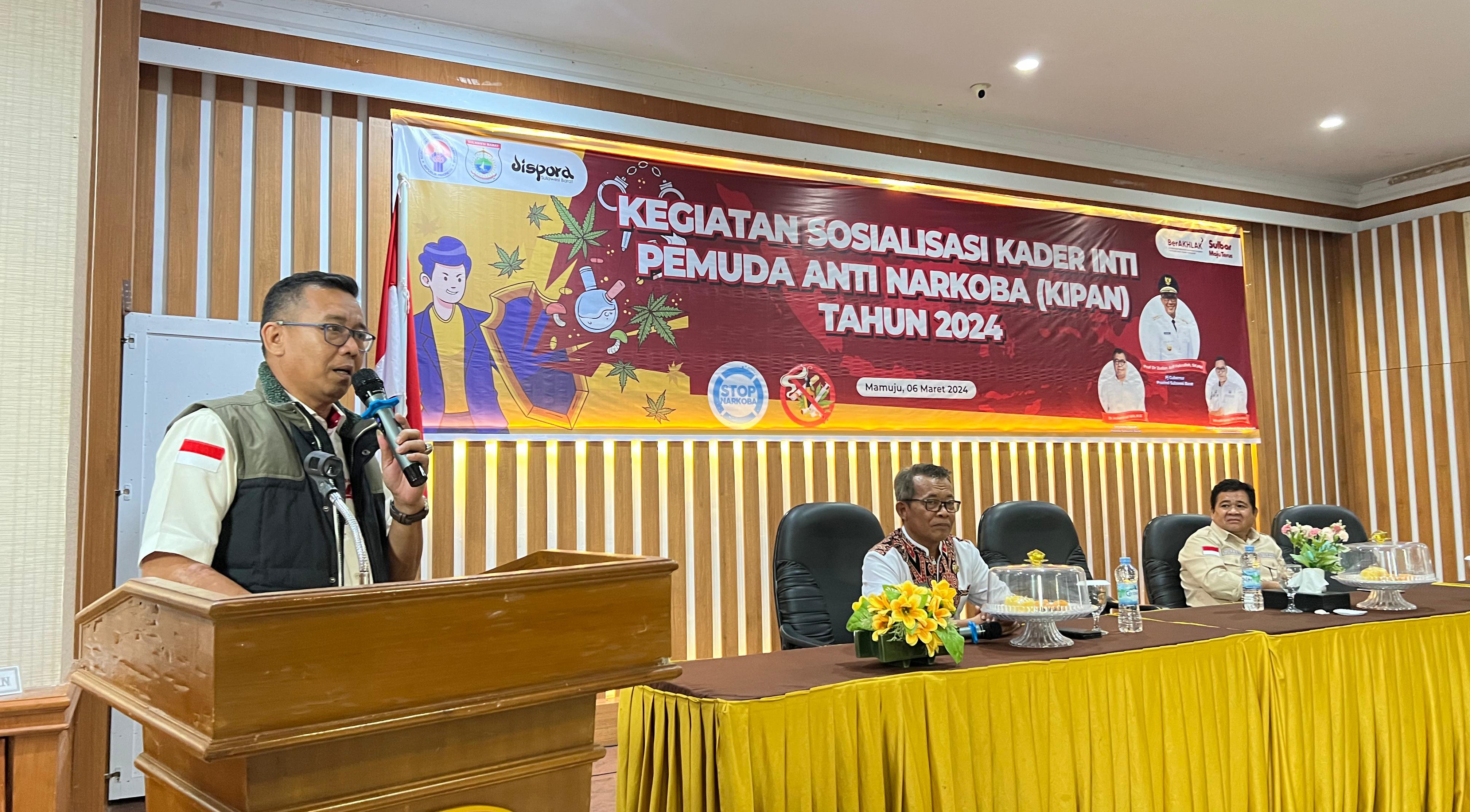 SULBARONLINE.COM, Mamuju — Dinas Kepemudaan dan Olahraga (Dispora) Provinsi Sulawesi Barat menggelar kegiatan sosialisasi Kader Inti Pemuda Anti Narkoba (KIPAN) tentang bahaya narkoba, Rabu (6/3/24) di Hotel Grand Mutiara Mamuju.