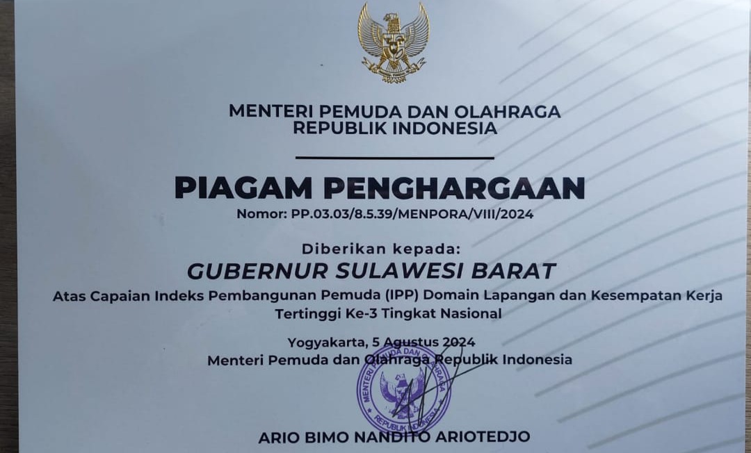 SULBARONLINE.COM, Jogja — Pemerintah Provinsi Sulawesi BaratĀ (Sulbar) kembali meraih penghargaan atas capaian Indeks Pembangunan Pemuda (IPP) dari Kementerian Pemuda dan Olahraga Republik Indonesia.