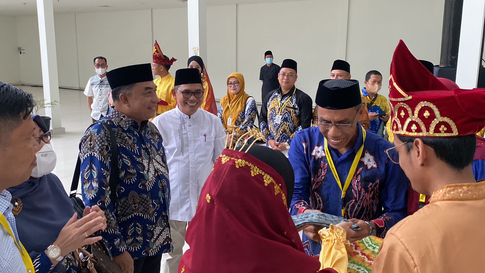 H. Syafrudin Baderung bersama ibu ketua DWP Hj. Armida Hanum Siregar tiba di bumi Lambung Mangkurat dengan pesawat Garuda pukul 14.25 disambut dengan pengalungan kain sasirangan oleh Kepala Kantor Kemenag Tanah Bumbu kepada Kakanwil Kemenag Sulbat, H. Syafrudin Baderung.