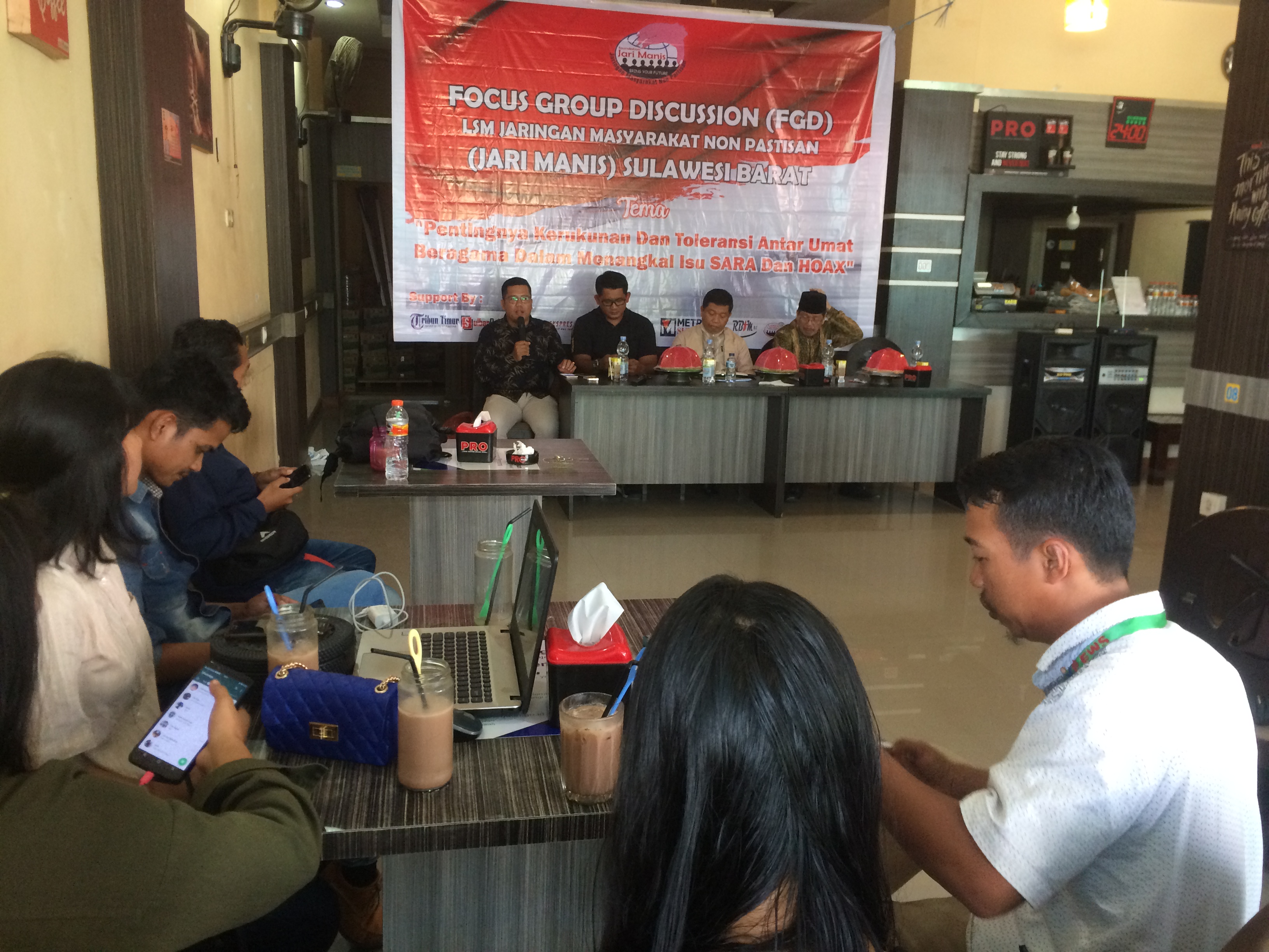 Diskusi LSM-Jari Manis kali ini mengangkat tema ‘Pentingnya Kerukunan dan Toleransi Ummat Beragama dalam menangkal isu SARA dan Hoax’, menghadirkan narasumber diantaranya Ketua Forum Kerukunan Ummat Beragama (FKUB) Sulbar, Sahabuddin Kasim, Kapolres Mamuju AKBP Muhammad Rivai Arvan, Majelis Ulama Indonesia (MUI) Sulbar, Misbahuddin.