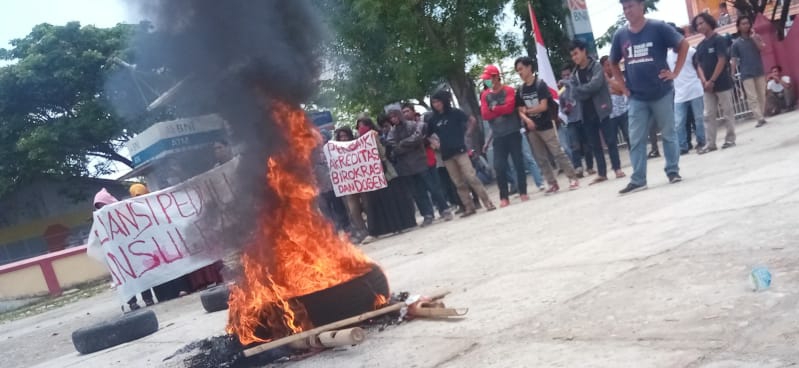 SULBARONLINE.COM,MAJENE—Puluhan mahasiswa dari Aliansi Peduli Unsulbar, menggelar aksi demonstrasi di depan gedung rektorat Universitas Sulawesi Barat di Majene, Senin (14/10).