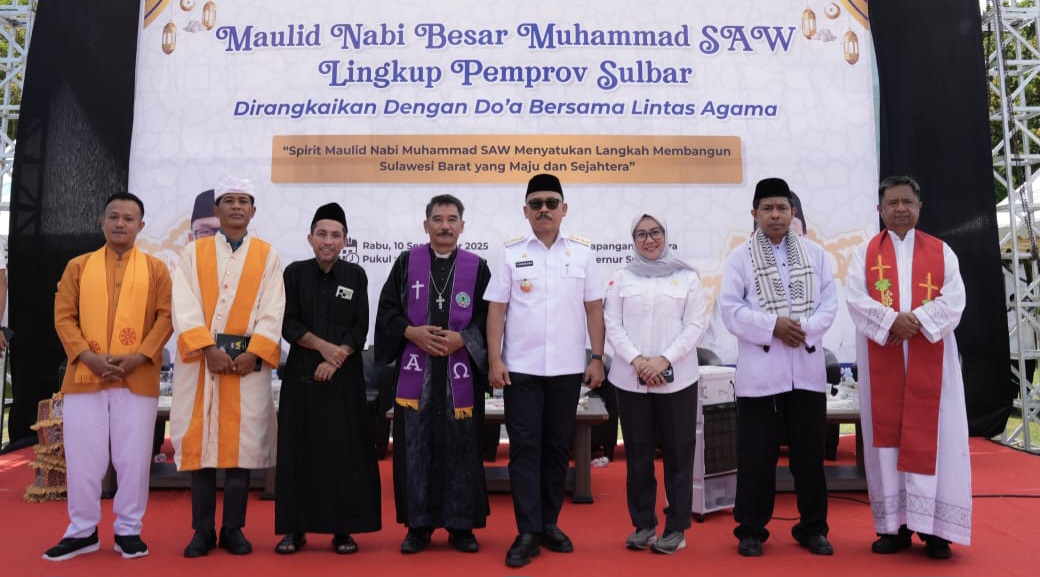 SULBARONLINE.COM, Mamuju – Pemprov Sulbar menggelar peringatan Maulid Nabi Besar Muhammad SAW yang dirangkaikan dengan doa bersama lintas agama di Lapangan Upacara Kantor Gubernur Sulbar, Rabu 10 September 2025.